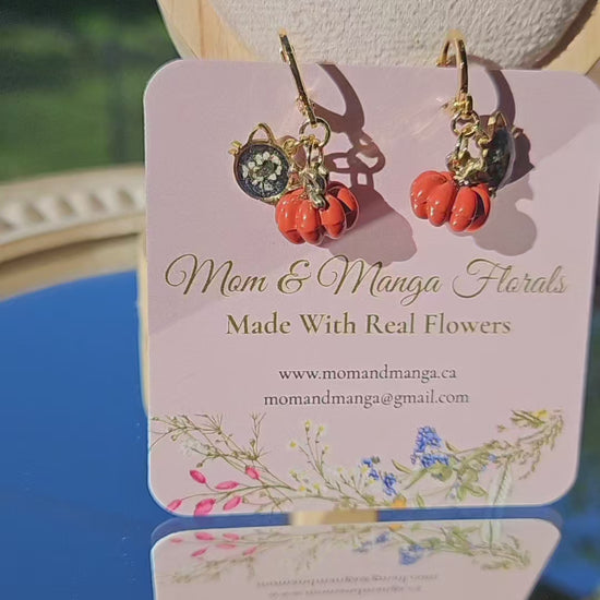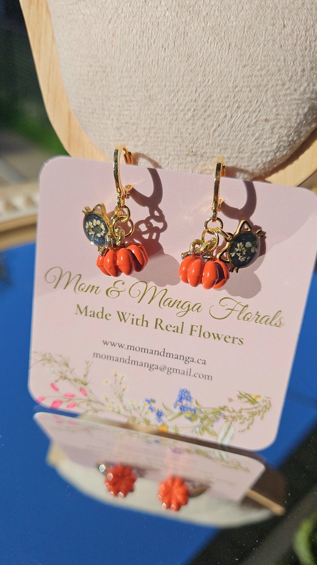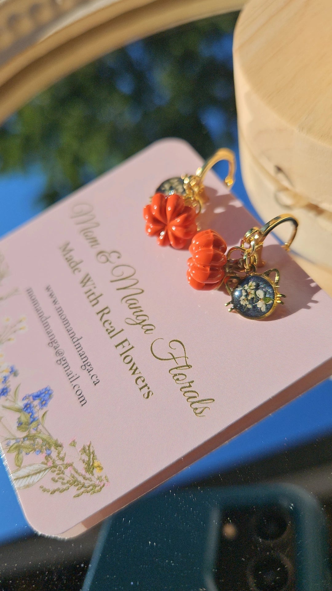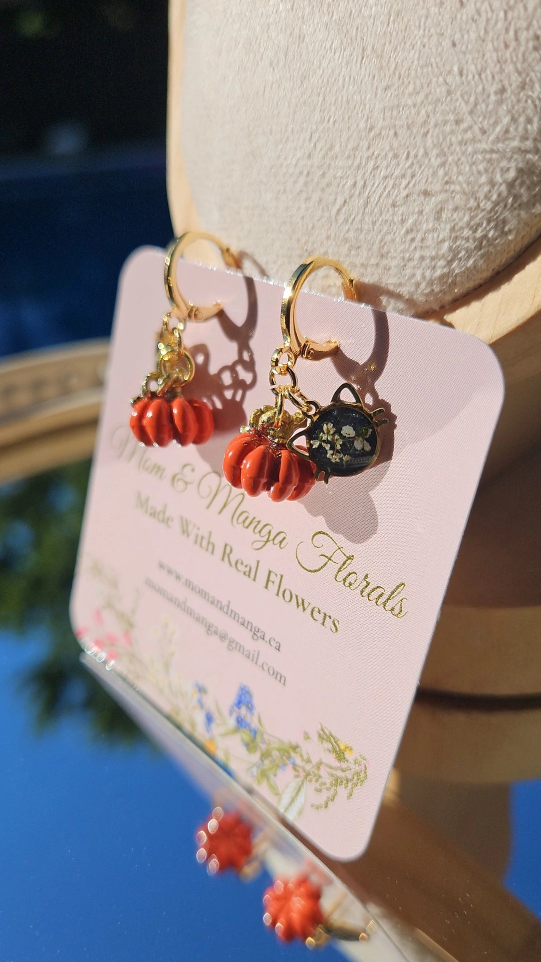 Its a hybrid of halloween favorites. Hand painted black kitty bezels with tiny Queen annes laces florals paired with the classic orange pumpkin. Finished with hypoallergenic 18k gold plated stainless steel huggies. A seasonal must have!