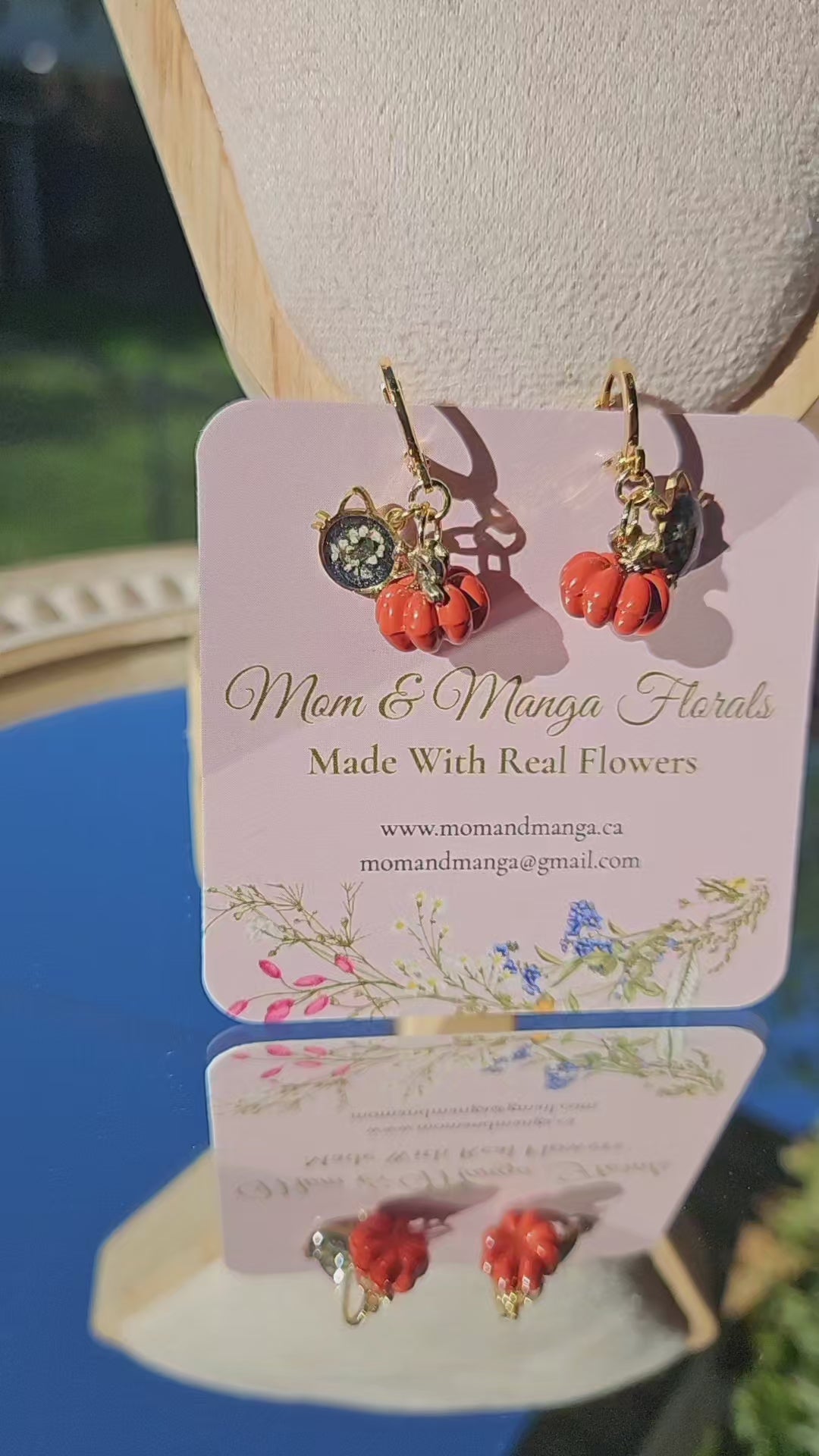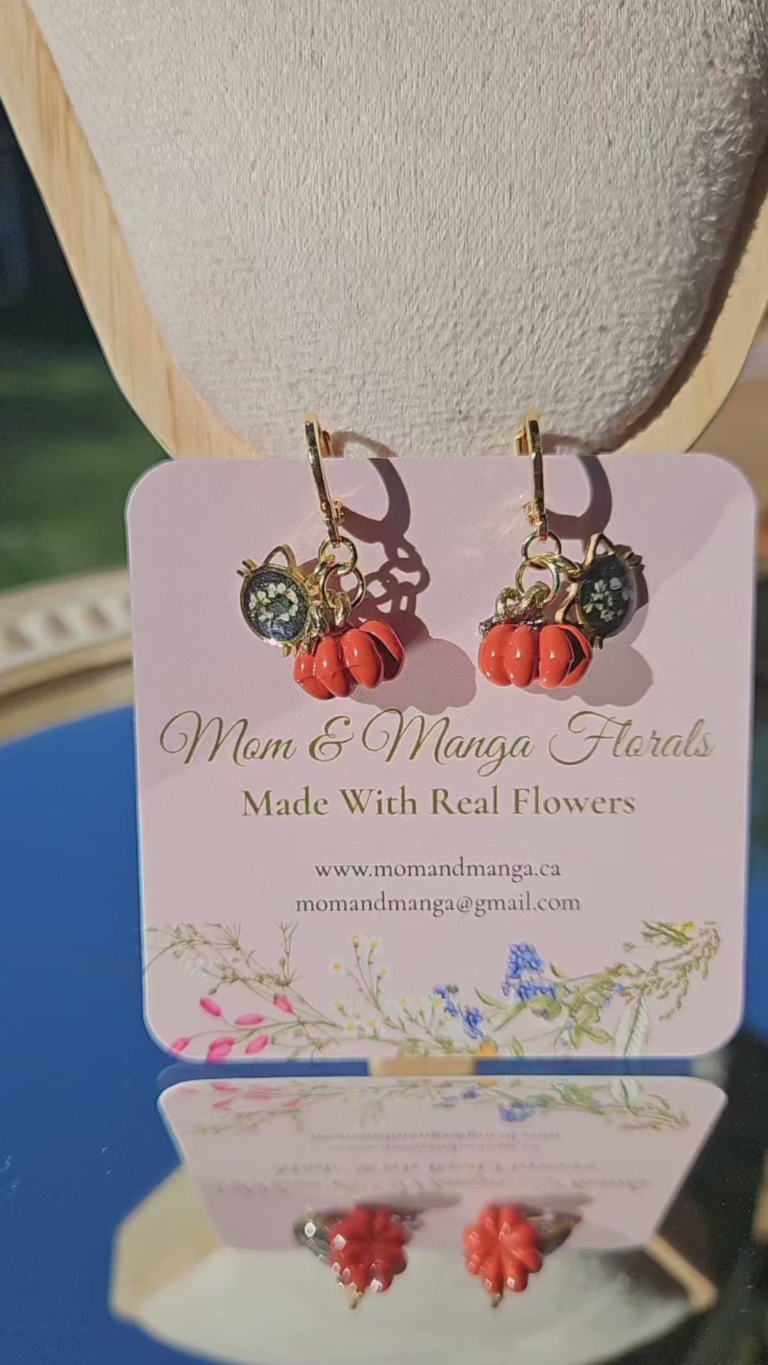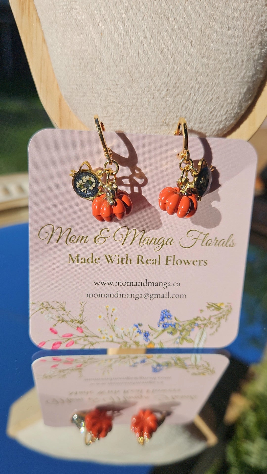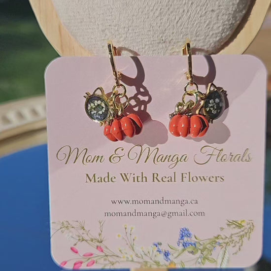 Its a hybrid of halloween favorites. Hand painted black kitty bezels with tiny Queen annes laces florals paired with the classic orange pumpkin. Finished with hypoallergenic 18k gold plated stainless steel huggies. A seasonal must have!