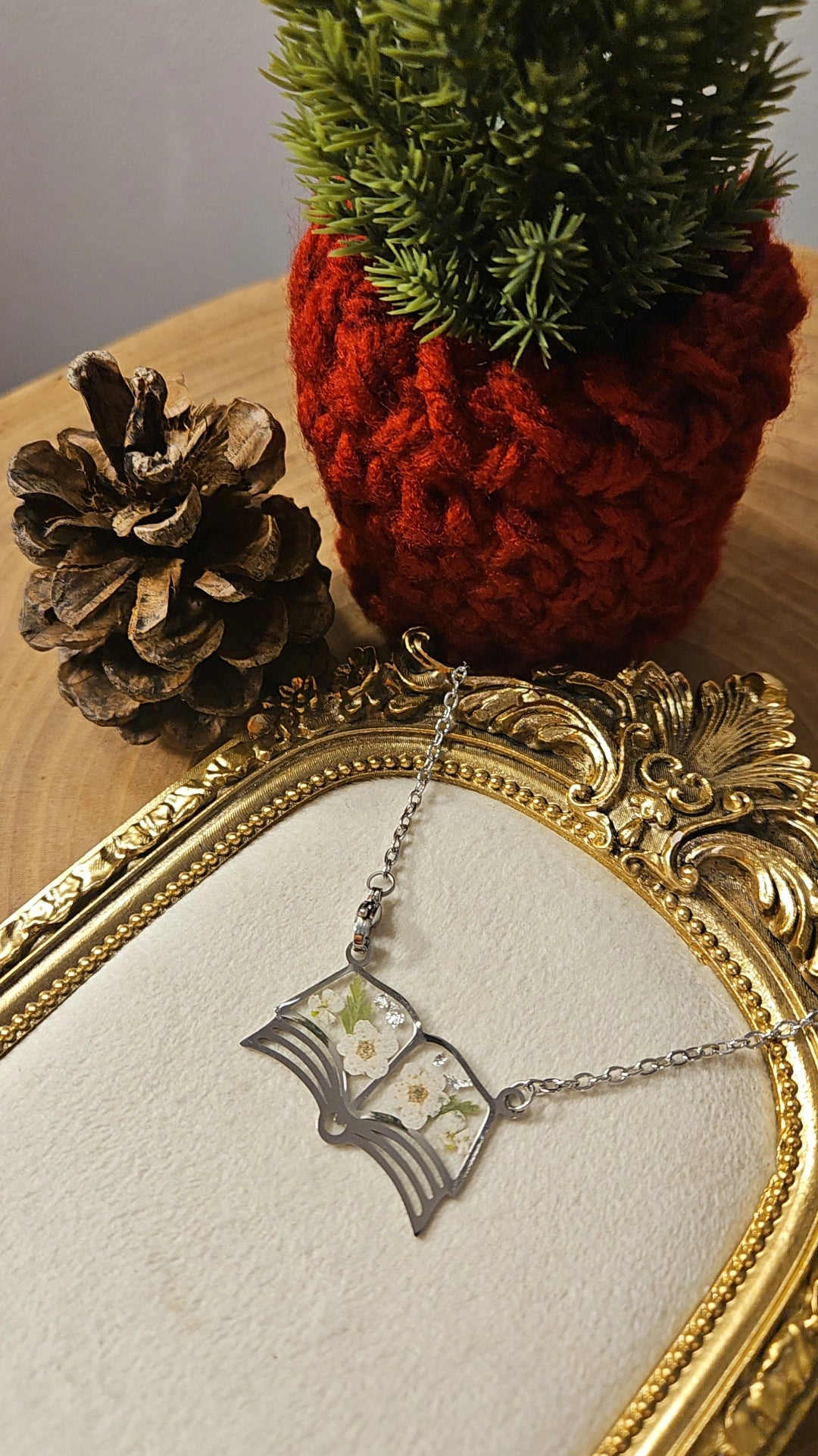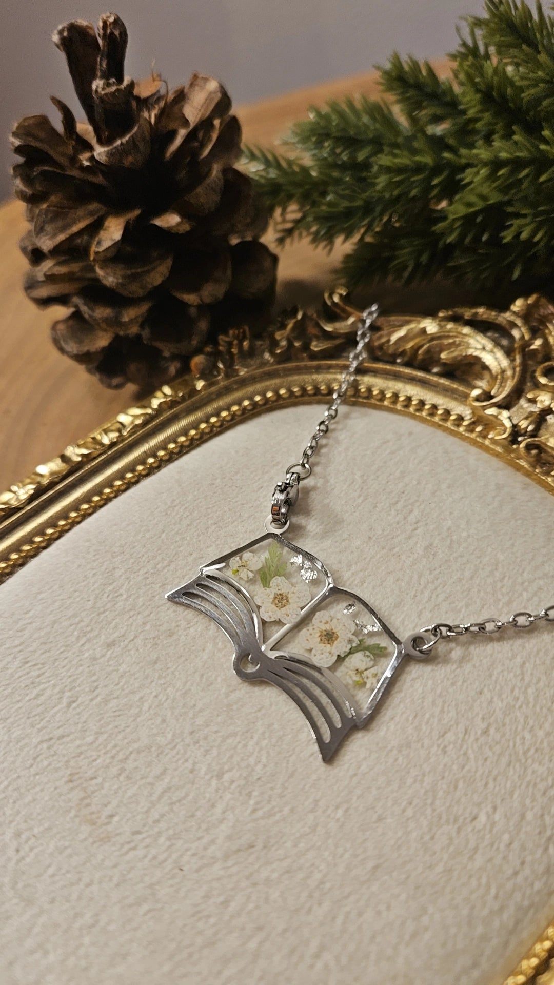 Our beautiful book necklaces are made with handpressed ferns and alyssums featuring silver leaf accents.