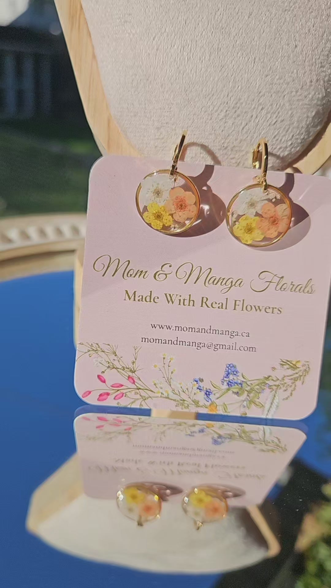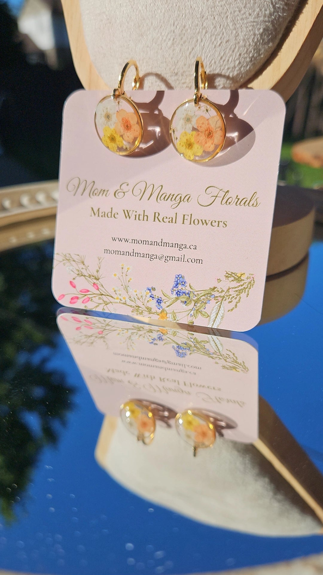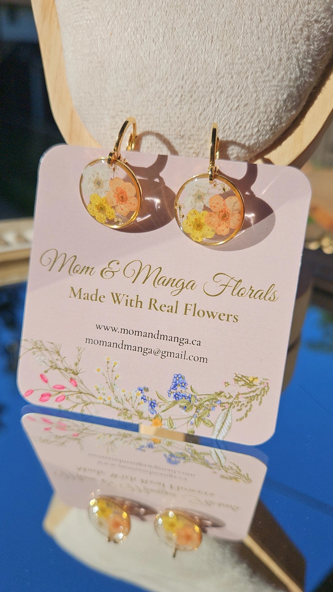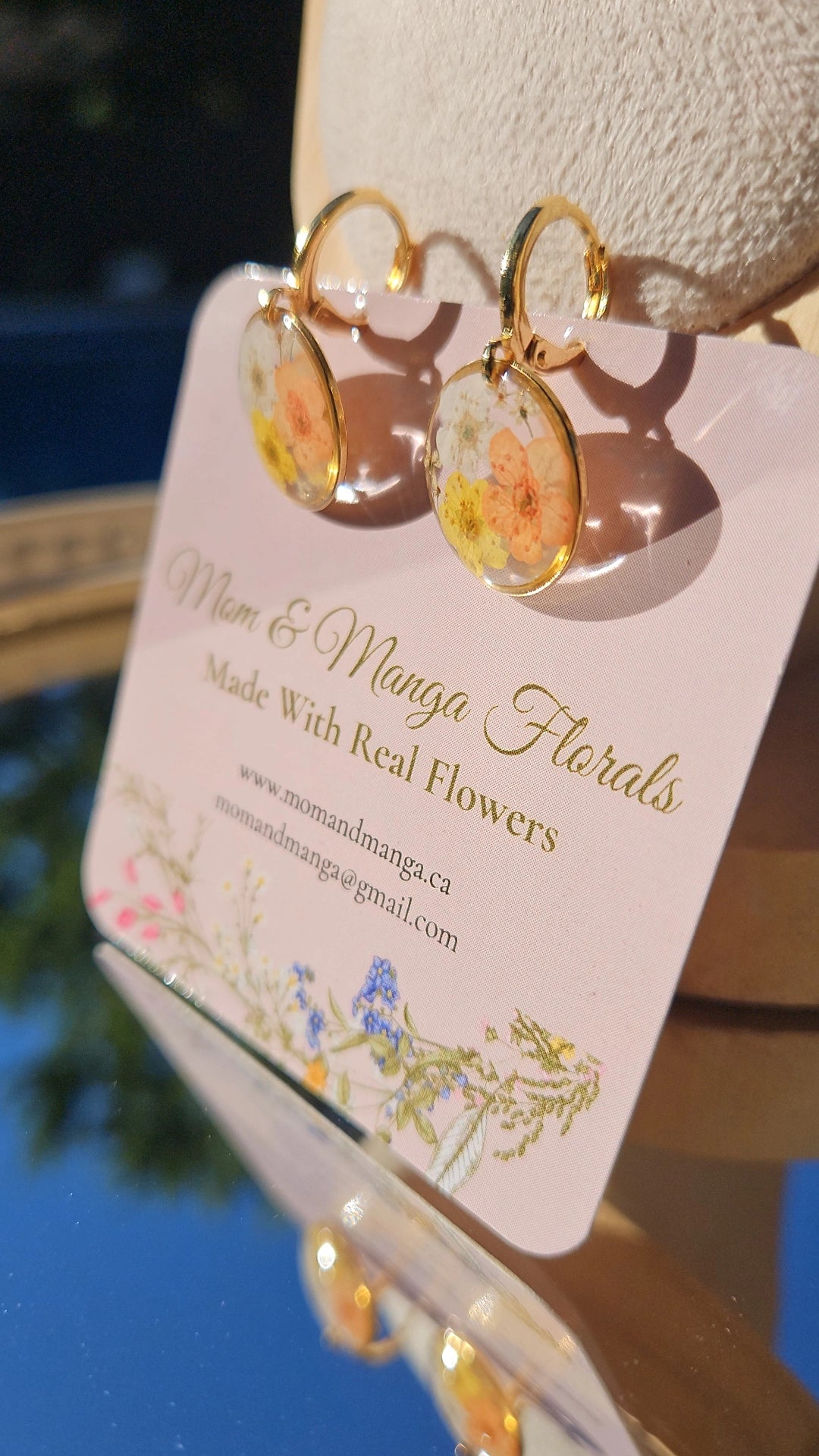 Variety of beautiful flowers in the classic candy corn colored. Finished with hypoallergenic 18 k gold-plated stainless steel.The assortment of lovely flowers is reminiscent of the classic candy corn colors. They are arranged in a delightful and eye-catching display that brings a smile to the face. The design incorporates elements of both elegance and fun, perfect for any occasion. This piece is completed with hypoallergenic 18k gold-plated stainless steel that ensures comfort and durability. The combination creates a stunning accessory that is both beautiful and gentle on the skin.