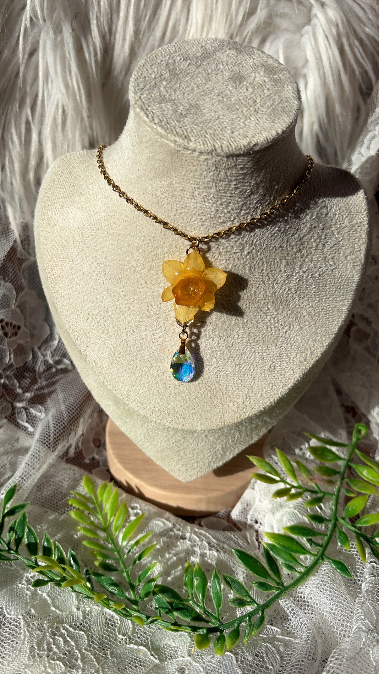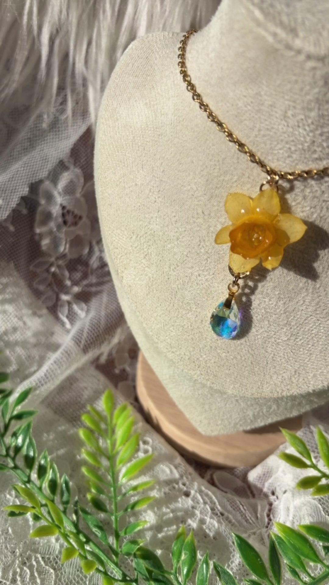 This stunning one-of-a-kind necklace features a classic mini daffodils, also known as dwarf or botanical narcissus.