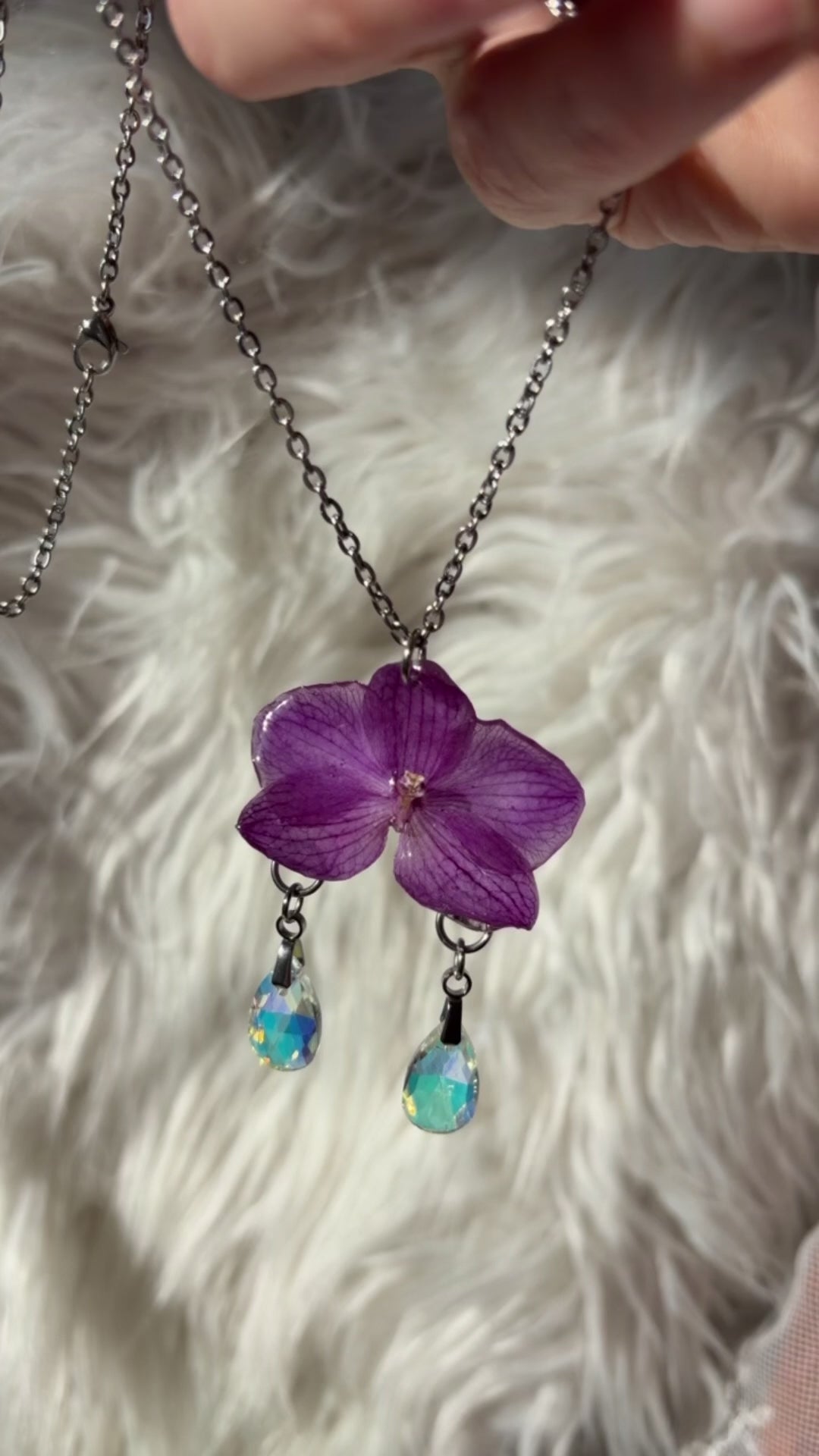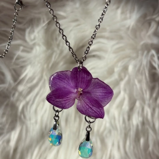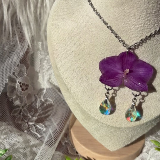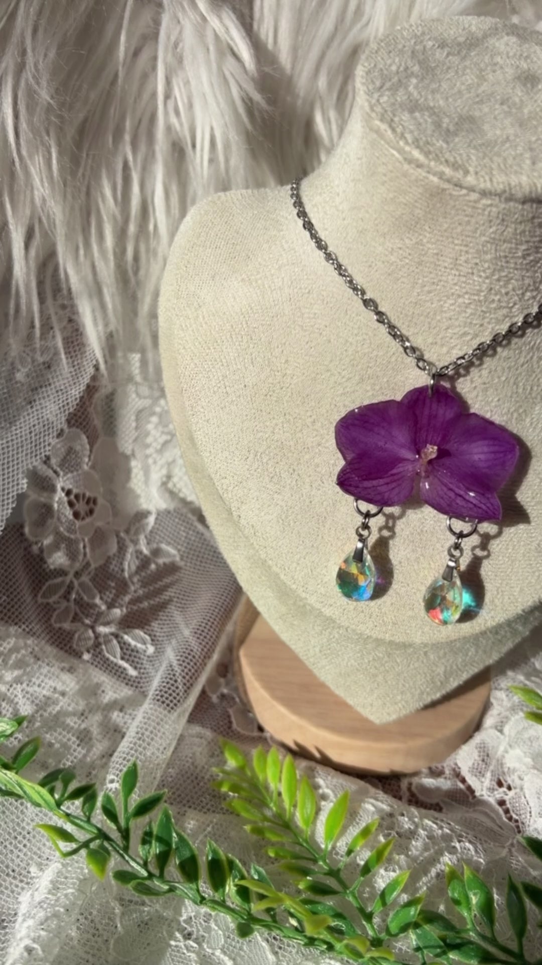 This stunning one-of-a-kind necklace features a classic purple (Phalaenopsis) and two Swarovski styles tear drop pendants. Finished on high quality 304 stainless steel chain.