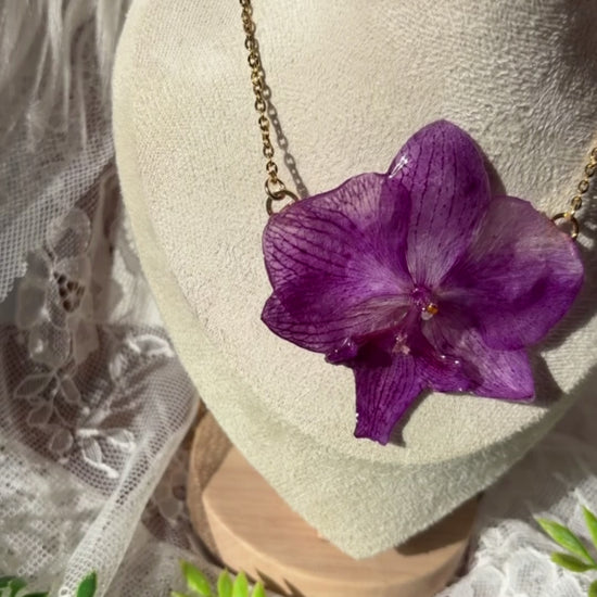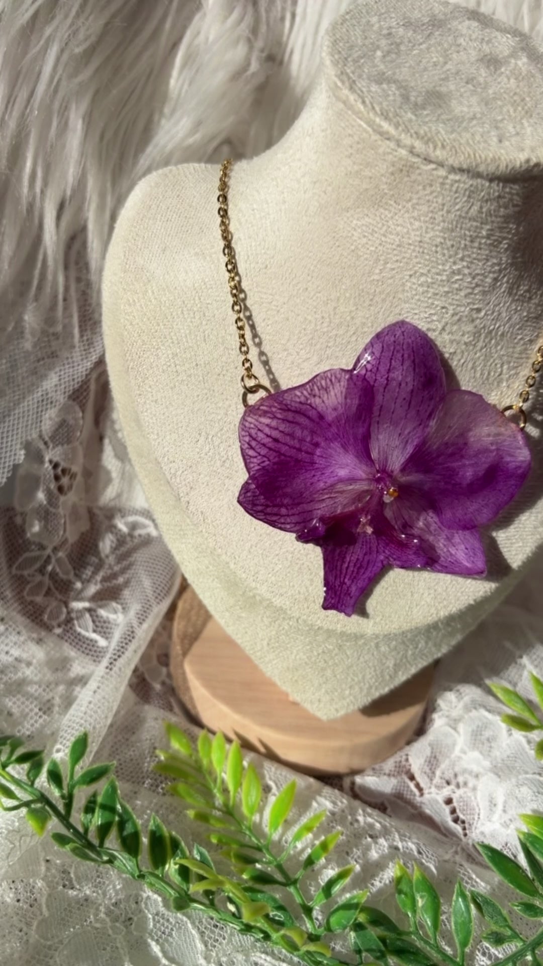 This stunning one-of-a-kind necklace features a classic extra large purple moth orchid (Phalaenopsis). Finished on high quality 304 stainless steel chain.