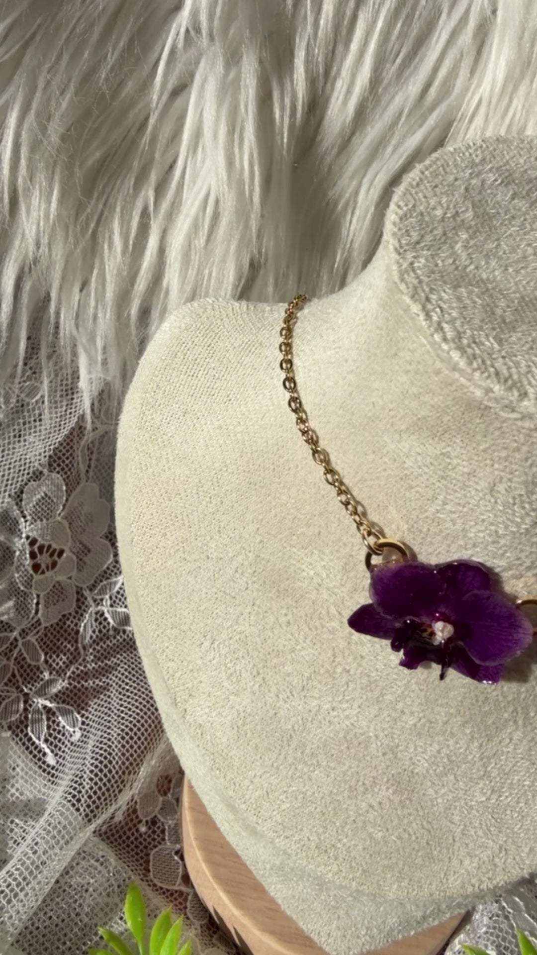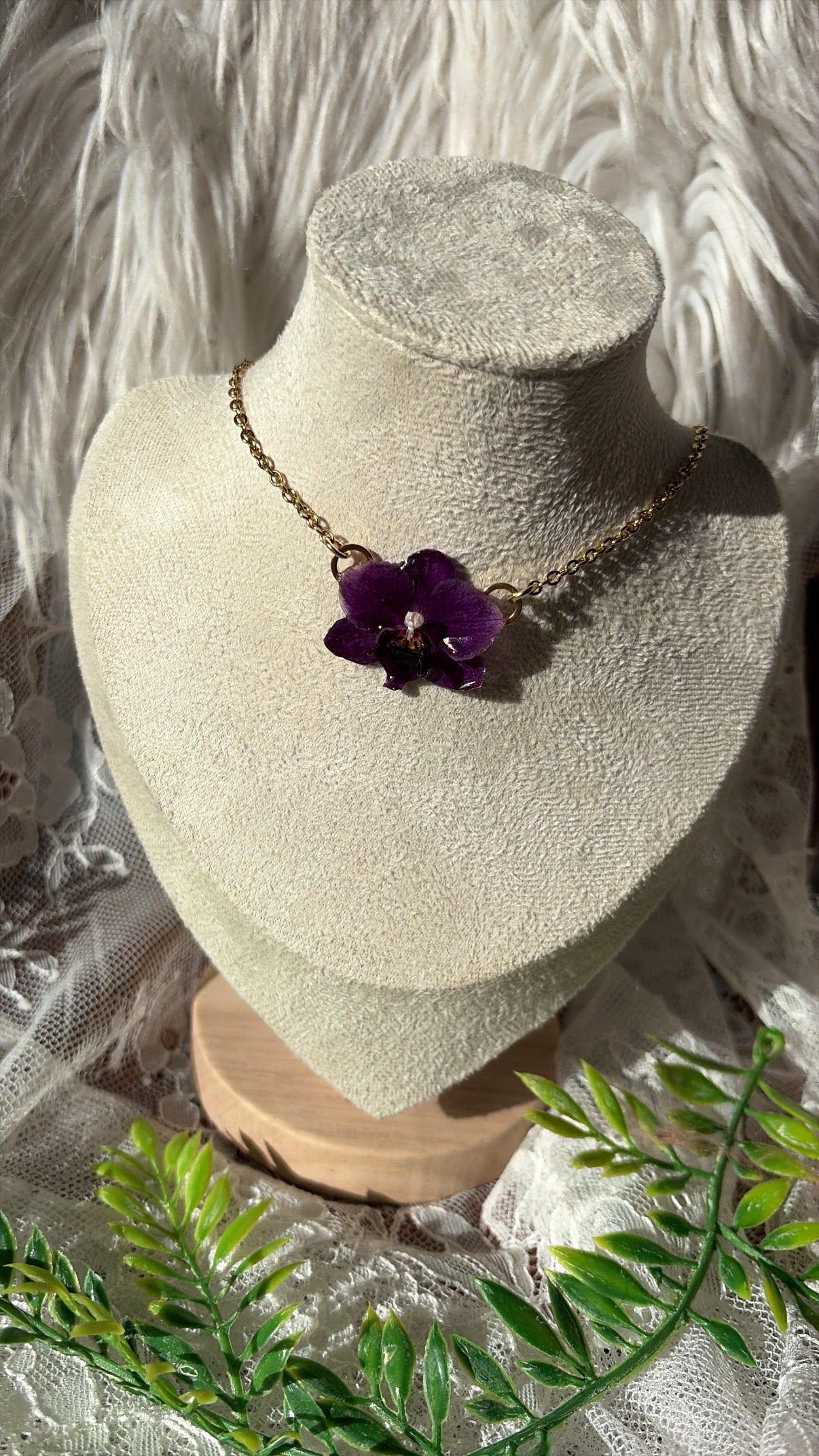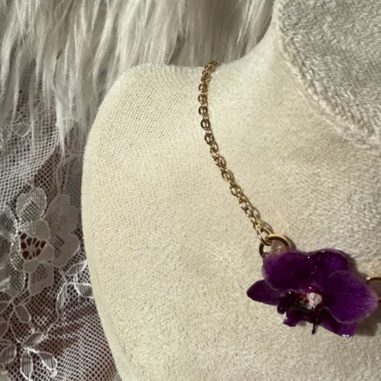 This stunning one-of-a-kind necklace features a classic purple dwarf moth orchid. (Phalaenopsis). Finished on high quality 16" 304 stainless steel chain.