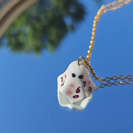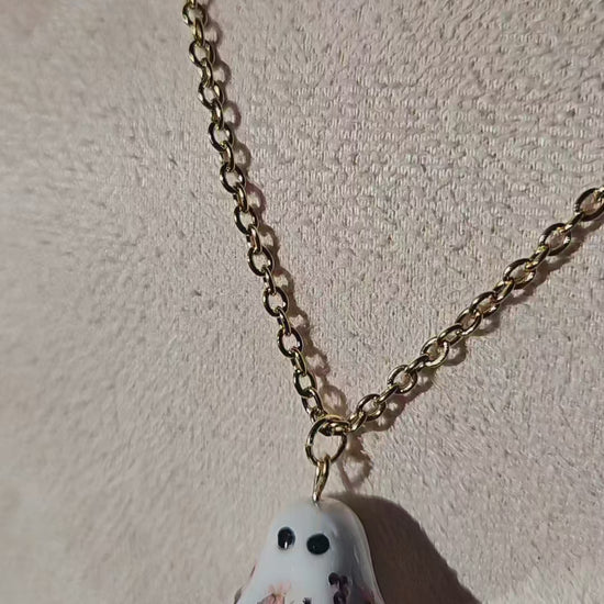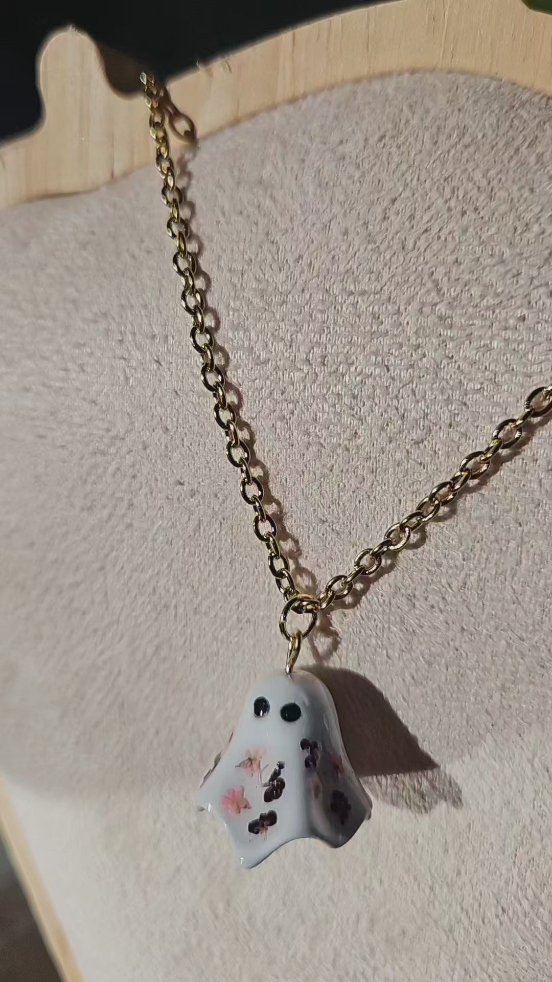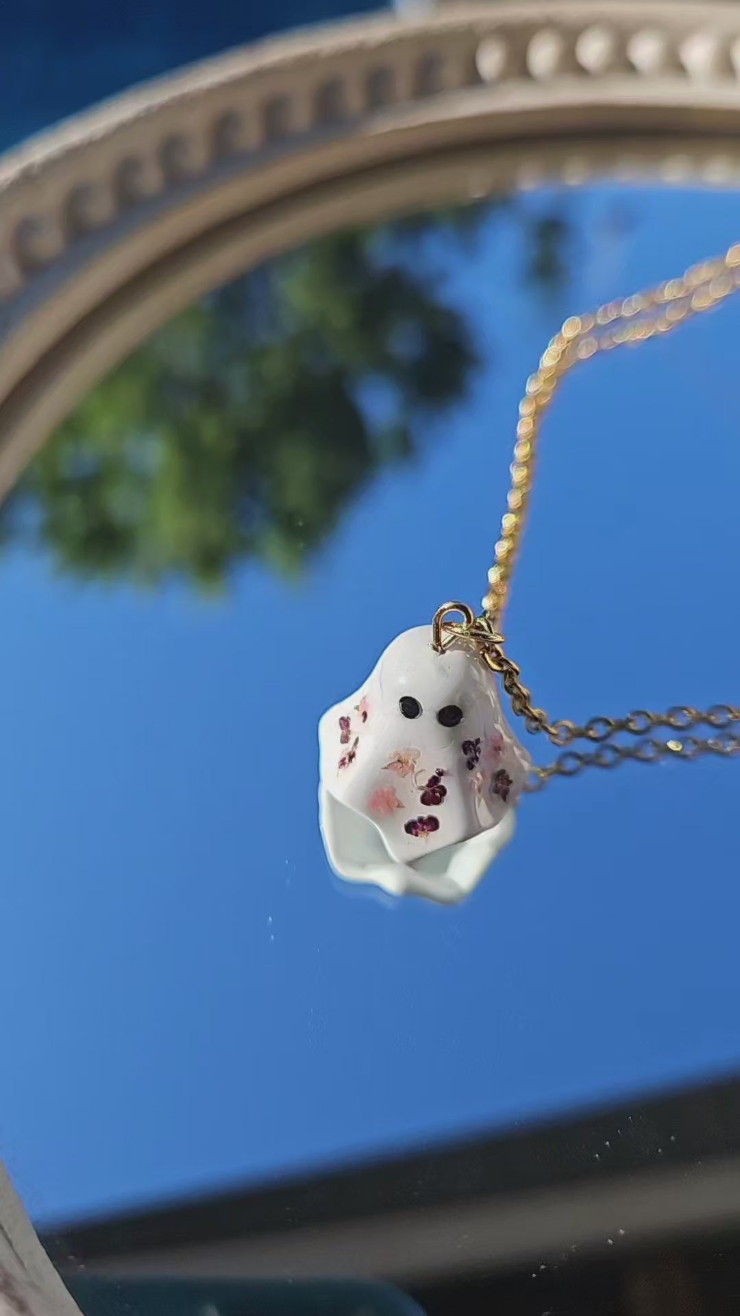Delicate little ghosts wrapped in dainty florals — the perfect mix of spooky and sweet. Hung on an 18” hypoallergenic chain, it’s light, comfortable, and made to wear all season long.