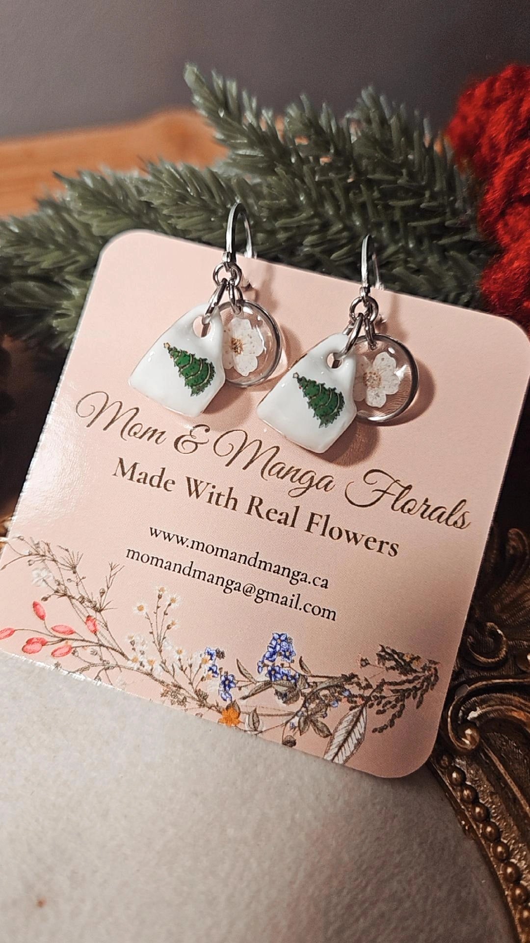 A Mom & Manga Florals Classic. Tiny ceramic Teacups featuring Christmas trees paired with small white alyssum.