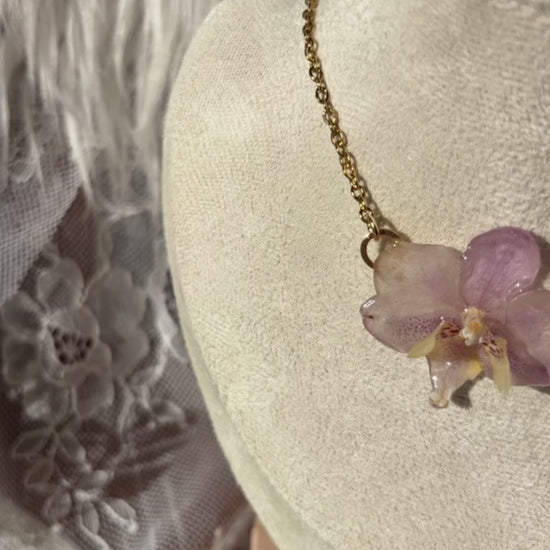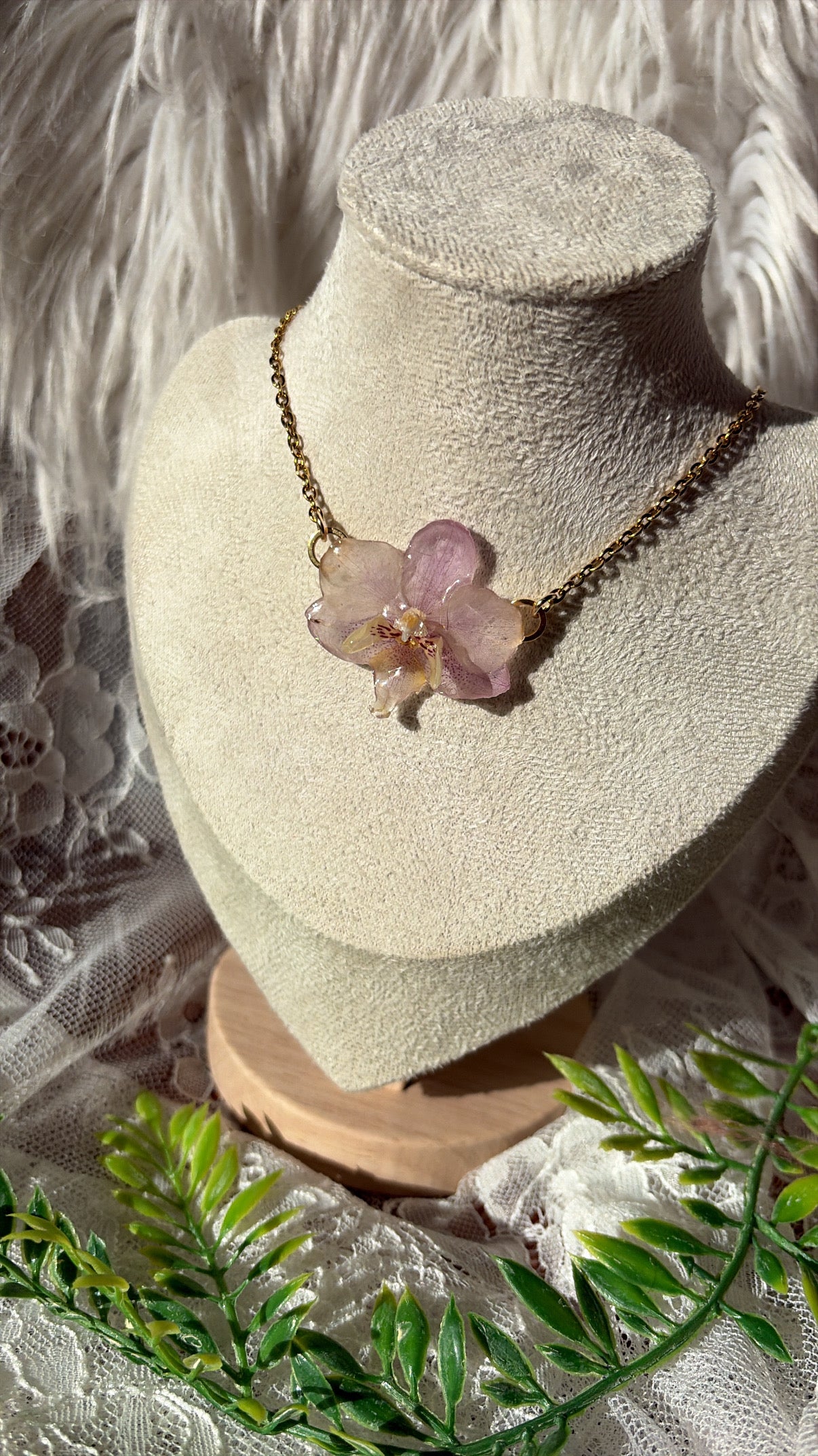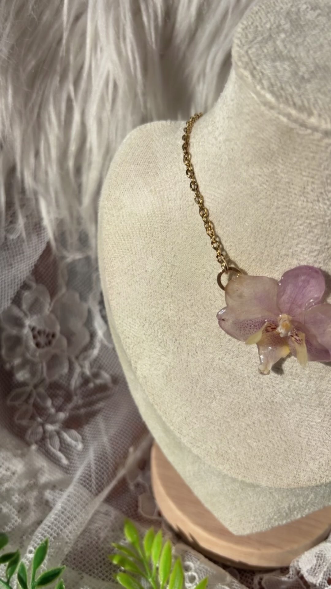 This stunning one-of-a-kind necklace features a classic purple (Phalaenopsis). Finished on high quality 304 stainless steel chain.