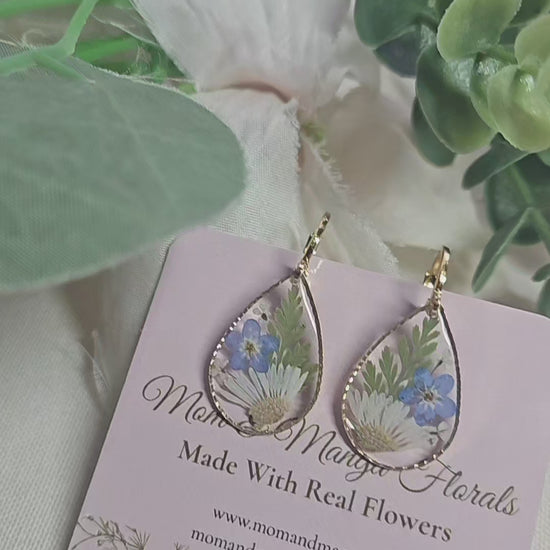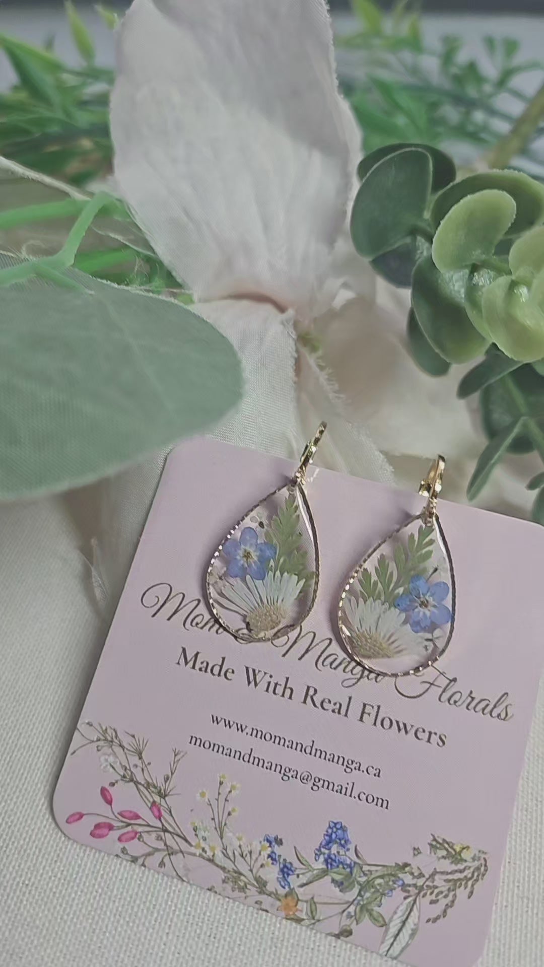 Beautifully hand pressed flowers, grown right in Niagara. These teardrop earrings feature alyssum, fern, Queen Annes lace and forget me nots.