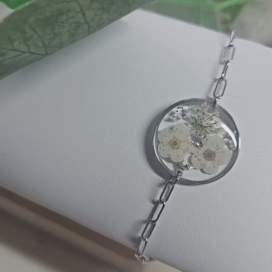 Beautifully hand pressed flowers, grown right in Niagara. This bracelet features alyssum, Queen Annes lace and a touch of silver leaf.